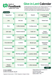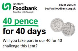 Just find an old jam jar or similar container and start collecting 40p for 40 days, then send the money by bank transfer or cheque to Bedford Foodbank